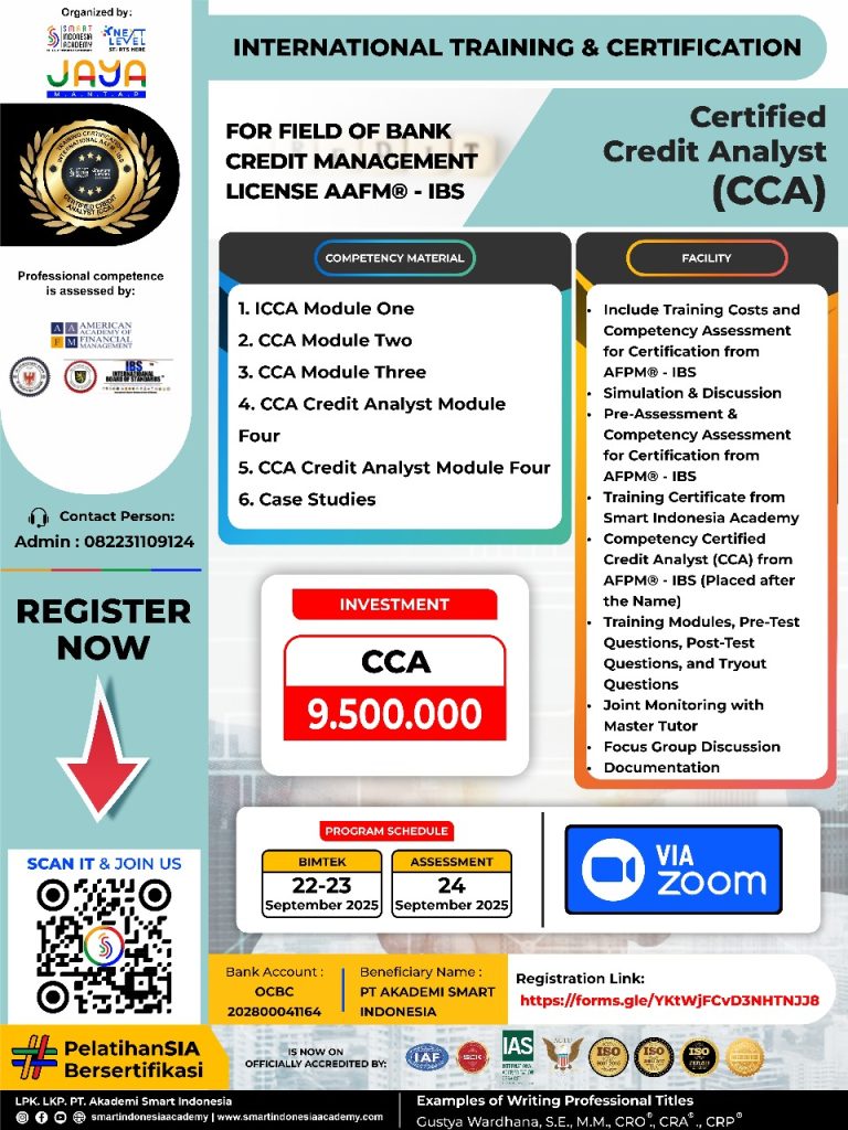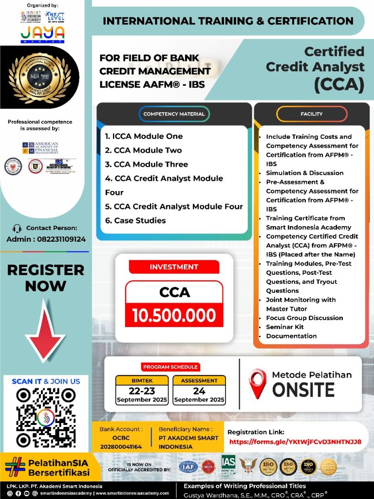 The International Training and Certification by AAPM – IBS for Certified Credit Analyst CCAis designed to enhance the skills and expertise of professionals engaged in credit analysis and risk assessment. This program establishes internationally recognized standards for evaluating creditworthiness and financial stability, ensuring that certified credit analysts possess the necessary knowledge to perform their roles effectively. By providing rigorous training and certification, the program builds trust and confidence among stakeholders, including lenders and borrowers, who rely on accurate credit evaluations.